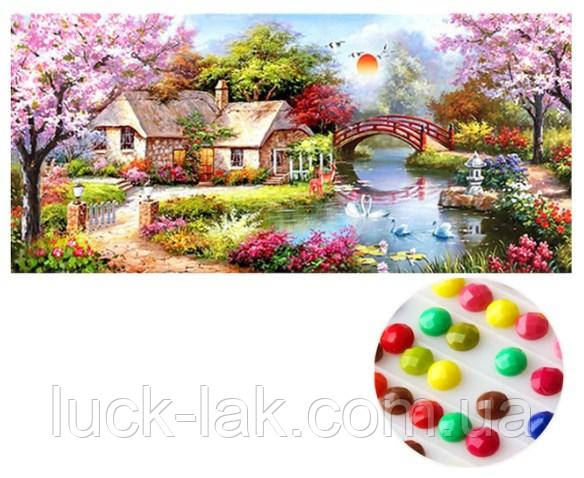 Алмазна вишивка будиночок біля річки 65х30 см, повна викладка, круглі стрази