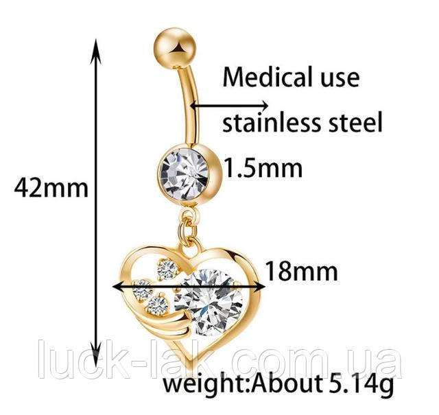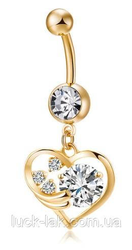 Сережки пірсинг у пупок із підвіскою серце з кристалами, колір — золото