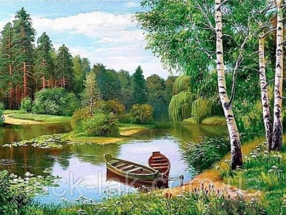 Алмазна вишивка човника на озері 40х30 см, повна викладка, квадратні стрази