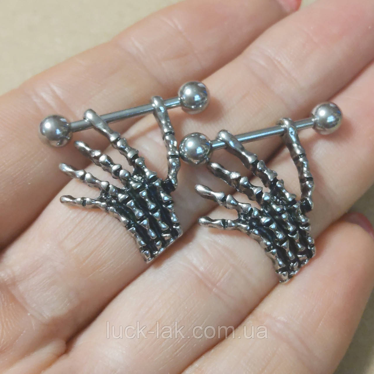 Пірсинг для сосків із кістячими руками підкреслить Вашу оригінальність.