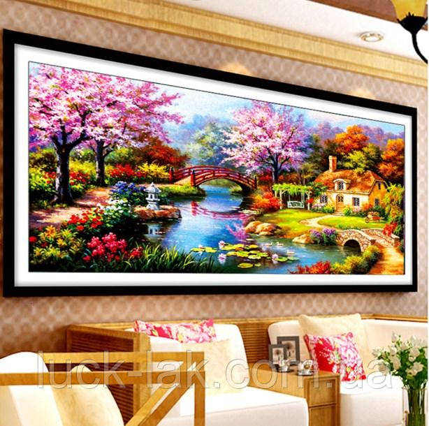 Алмазна вишивка, з садом і квітучою сакурою, затишний будиночок біля ставка