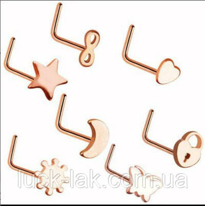 Набір 7 шт. пірсинг, сережки для носа, нострила, форма ніжки L, різна форма верхнього прикрашання. Купуючи набір, ви отримуєте можливість змінювати прикрасу щодня. Серце, метелик, зірочка, місяць, нескінченність, метелик, замок — прикраса може підходити під настрій:)